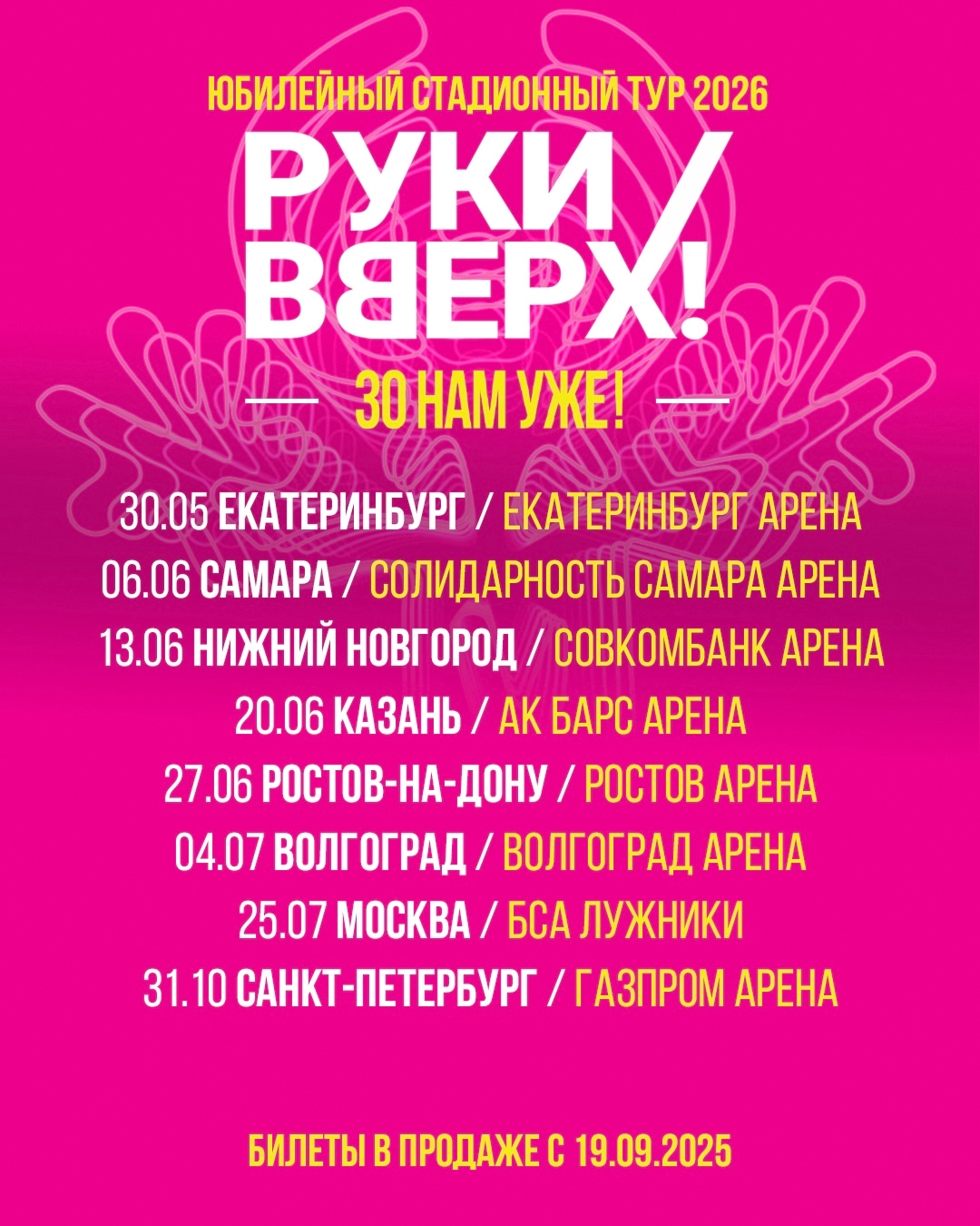 27 июня 2026 года на сцене стадиона «Ростов Арена» города Ростова-на-Дону состоится концерт группы Руки Вверх!, которые исполнят новые треки и полюбившиеся хиты прошлого, в рамках нового, большого, стадионного тура команды!